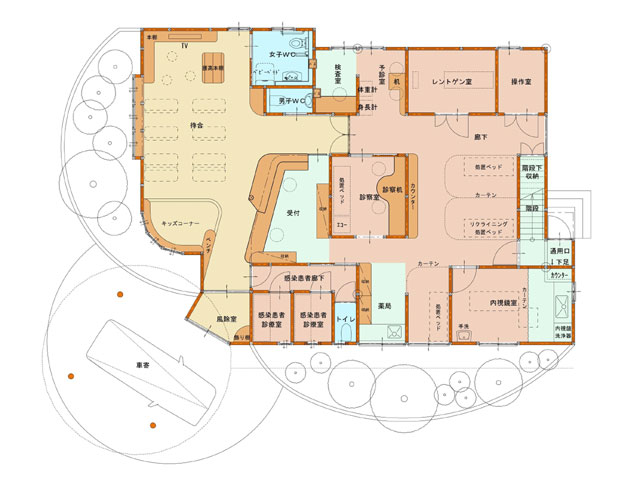 内科クリニックの計画です。子供から高齢者まで、威圧感を与えず、迎え入れることをめざし子供たちの原風景に残るような温かい「家」を模した外観イメージをもたせつつも、病院関係者と患者そして感染患者の動線交差を極力なくすことをコンセプトに考慮して計画しております。