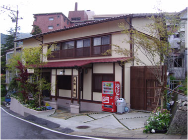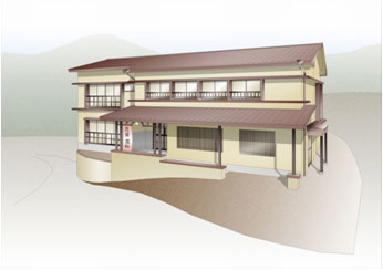 温泉地にある旅館のイメージと、大正ロマンというコンセプトのもと、和風の落ち着きを持たせるために、水平性を強調した庇を設け、正面既設の切妻屋根を大屋根と同じ勾配方向に変更しその下のアプローチからお客さまを迎え入れることができます。 色調や装飾は大正時代に一番取り入れられたアールヌーボー風のものとし、古湯地区のあたらしいまちなみファサードの創出を目指します。